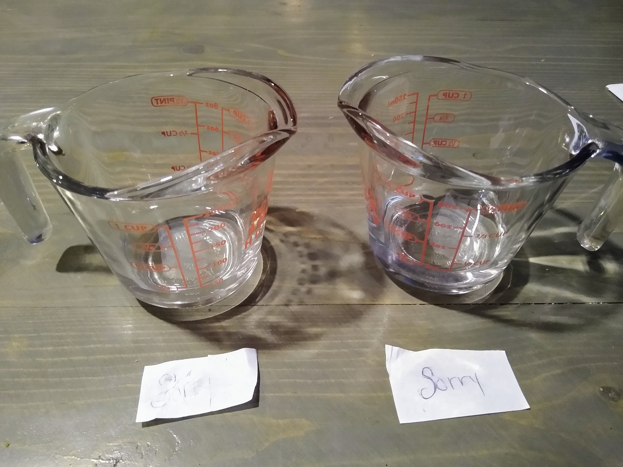 “I’m going to show you what that means. Here is your apology.” I wrote the word ‘sorry’ on a piece of paper and put it in a cup of water. I then wrote the word ‘sorry’ and put it in a cup of peroxide.