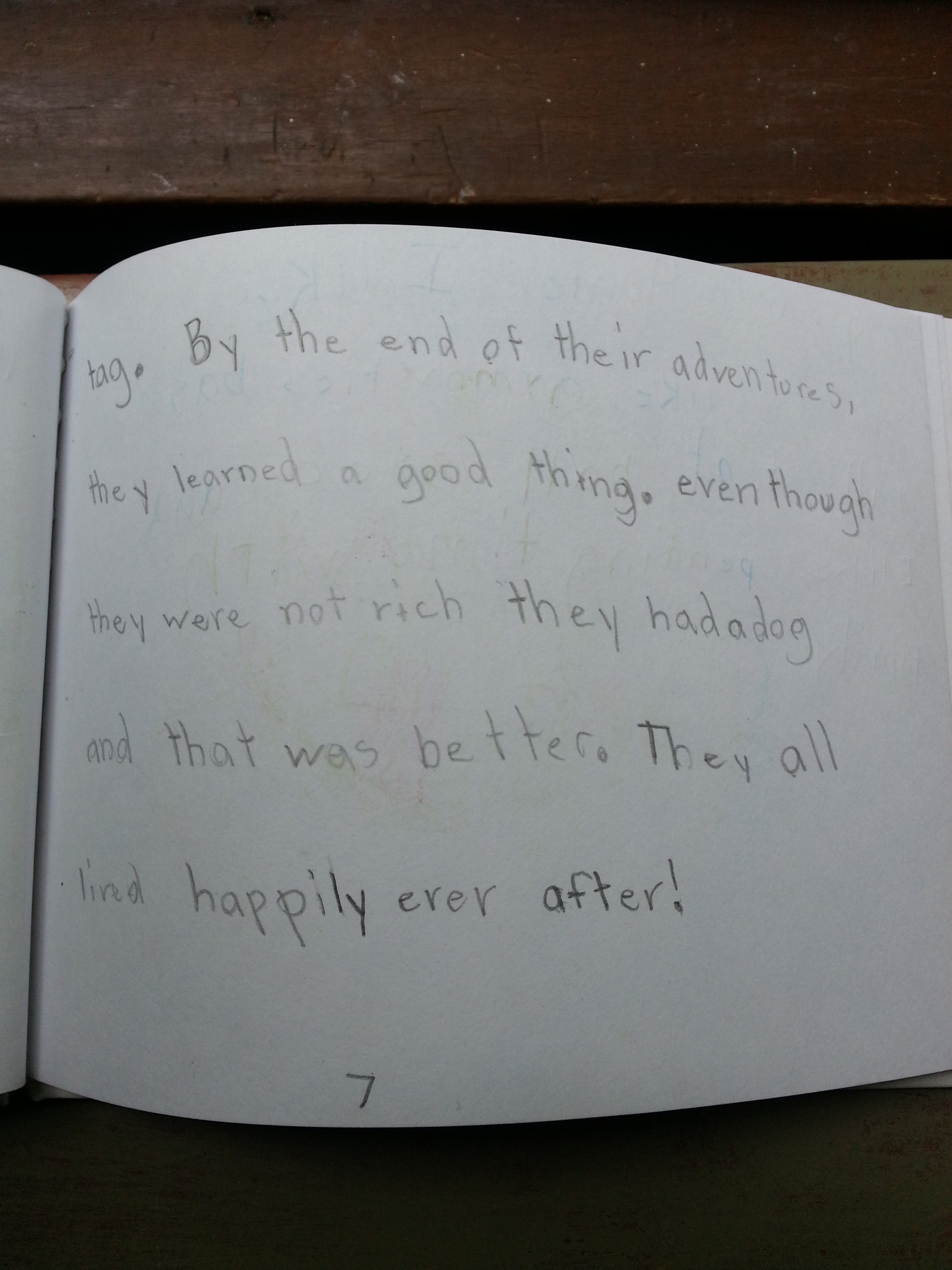 At the end of the story, my son wrote, “By the end of their adventures, they learned a good thing. Even though they were not rich, they had a dog, and that was better.”